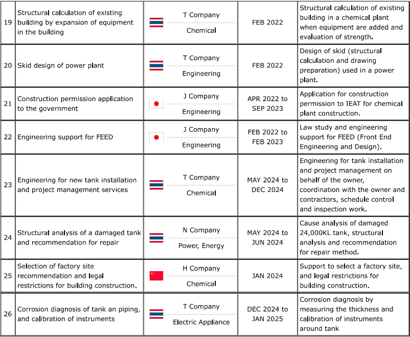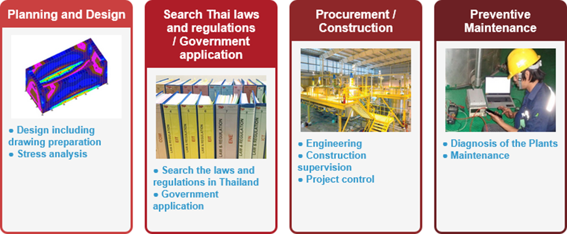 After many years of experience as a plant EPC contractor, we launched a design and consulting business in 2016. Design firms and technical support consultants are very few in Thailand, operated almost exclusively by individuals or small groups. Many of these services face capacity issues and difficulty meeting deadlines, making them impractical for actual application. We are managed by Japanese engineers, placing emphasis on high quality and, above all, on punctuality. Our goal is to provide design outsourcing services in situations where a design staff member suddenly leaves the company or the volume of work is too large to complete in a short period of time. Depending on the nature of the work, there may also be cases where it is desirable for us to be based at the client’s workplace for a period of time, and this is also possible.